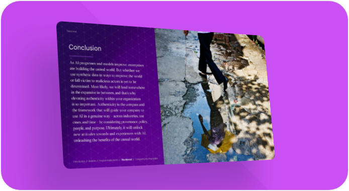 The Unreal #TechVision Conclusion As AI progresses and models improve, enterprises are building the unreal world. But whether we use synthetic data in ways to improve the world or fall victim to malicious actors is yet to be determined. Most likely, we will land somewhere in the expansive in-between, and that’s why elevating authenticity within your organization is so important. Authenticity is the compass and the framework that will guide your company to use AI in a genuine way – across industries, use cases, and time – by considering provenance, policy, people, and purpose. Ultimately, it will unlock new attitudes towards and experiences with AI, unleashing the benefits of the unreal world. Introduction // WebMe // Programmable World // The Unreal // Computing the Impossible 70