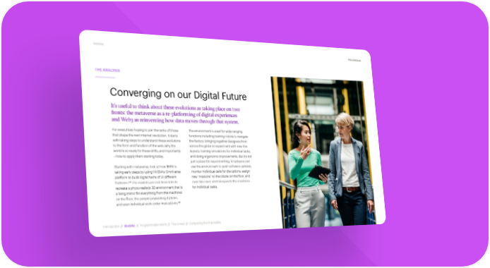 WebMe #TechVision THE ANALYSIS Converging on our Digital Future It’s useful to think about these evolutions as taking place on two fronts: the metaverse as a re-platforming of digital experiences and Web3 as reinventing how data moves through that system. For executives hoping to join the ranks of those The environment is used for wide-ranging that shape the next internet revolution, it starts functions including training robots to navigate with taking steps to understand these evolutions the factory, bringing together designers from to the form and function of the web, why the across the globe to experiment with new line world is so ready for these shifts, and importantly layouts, training simulations for individual tasks, – how to apply them starting today. and doing ergonomic improvements. But it’s not just a place for experimenting. Employees can Starting with metaverse, look at how BMW is use the environment to push software updates, taking early steps by using NVIDIA’s Omniverse monitor individual cells for disruptions, assign platform to build digital twins of 31 different new “missions” to the robots on the floor, and 43 factories. The models use real-time data to even take over and teleoperate the machines recreate a photo-realistic 3D environment that is for individual tasks. a living mirror for everything from the machines on the floor, the people populating stations, 44 and even individual work-order instructions. Introduction // WebMe // Programmable World // The Unreal // Computing the Impossible