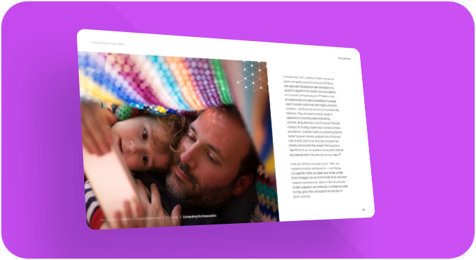 Computing the Impossible #TechVision In September 2021, Goldman Sachs released a paper, alongside partners IonQ and QC Ware, that captured the practical demonstration of a quantum algorithm for Monte Carlo simulations 184 on a Quantum Processing Unit. Monte Carlo simulations are complex probabilistic forecasts used to predict outcomes with highly uncertain variables – and they can be very computationally intensive. They are used in a wide range of applications including sales forecasting, robotics, drug discovery, and of course, financial markets. By finding a faster way to execute these simulations, Goldman Sachs is positioning itself to better forecast markets, evaluate risk in financial instruments, and more. And the company has already announced they expect their quantum algorithms to run on quantum computers that will 185 be available within the next two to four years. Each one of these compute areas – HPC, bio- inspired compute, and quantum – contributes to a specific niche, but taken as a whole, a clear trend emerges: We are in the midst of an evolution towards machines that, down to the very physics of their operation, are unlike any in existence today. As they grow, they will expand the window of what’s possible. Introduction // WebMe // Programmable World // The Unreal // Computing the Impossible 82