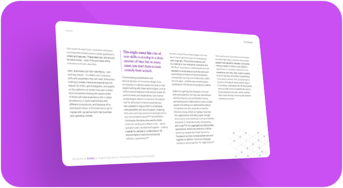 WebMe #TechVision This means to even have a presence enterprise This might sound like a lot of And for many of these technologies, the best The importance of consortiums and industry must have the infrastructure to share applications new skills to develop in a short way to be an early innovator is by deploying standards like these is twofold. They enable widely and securely. These steps can, and should, amount of time, but in many them internally. This is what Accenture did greater interoperability between companies, be taken today – even if the end state of the by creating its own enterprise metaverse, the making it easier to deliver cross-platform metaverse remains uncertain. cases, you don’t have to start “Nth floor.” Accenture is deploying 60,000 VR experiences or to jointly collaborate on an entirely from scratch. headsets to employees around the world and experience, and they often make it possible Next, businesses can start identifying – and is providing immersive VR environments for to do so securely and without jeopardizing working toward – the Web3 and metaverse The increasing sophistication and onboarding, learning, and collaboration within a company’s privacy. And, by agreeing to a skills and capabilities they will need. Enterprises democratization of immersive design tools, the company – all while demonstrating best common framework when a technology is looking to create metaverse experiences will for instance, is making it easier than ever to start practices for VR rollouts and projects to clients. in its infancy, businesses can set themselves require 3D artists, game designers, and experts experimenting with these technologies. Look at up to provide more compatible services to on the platforms on which they plan to build. all the tools emerging to help people create 3D Aside from gaining the necessary in-house future shared consumers, which will help And companies chasing the opportunities environments and experiences. Epic Games’ skills and expertise, forming new partnerships them stand the test of time as the internet of Web3 will need experience with multiple Unreal Engine, which is a real-time 3D creation and ensuring you can participate in future continues to evolve. blockchains, to build relationships with tool for photoreal immersive experiences, partnerships and collaborations is also a critical different consortiums, and because of its was updated in August 2021 to emphasize aspect of building your technical foundation. distributed nature, to find partners to go to interoperability and cloud support, meaning Companies can join consortiums like the market with, as well as build new business that users can now access Unreal Engine from Khronos Group, which comprises more than and operating models. 66,67 150 organizations including Apple, Google, any normal web browser. And NVIDIA’s Omniverse, the same one used by BMW, and Amazon and is working to set open industry connects existing 3D software tools – which standards for extended reality, 3D graphics, 69 typically haven’t worked well together – making and more. Or for organizations building Web3 it easier for people to collaborate on 3D applications, there’s the InterWork Alliance environments in real time and across which has created the Token Taxonomy 68 Framework so that multiple parties can work software applications. together to define a “common language, 70 behaviors, and properties” for digital tokens. Introduction // WebMe // Programmable World // The Unreal // Computing the Impossible 37