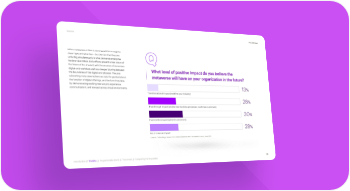 WebMe #TechVision Either metaverse or Web3 alone would be enough to draw hype and attention – but the fact that they are unfurling simultaneously is what demands enterprise Q leaders take notice. Early efforts present a new vision of the future of the internet, with the creation of immersive digital-only worlds as well as a deeper blurring between What level of positive impact do you believe the the boundaries of the digital and physical. They are subverting many assumptions we take for granted about metaverse will have on your organization in the future? the function of digital offerings, and the form they take, by demonstrating exciting new ways to experience, communicate in, and transact across virtual environments. 13% Transformational impact (redefine your industry) 28% Breakthrough impact (enable new business processes, reach new customers) 30% Incremental impact (optimize processes) 28% No or minimal impact Source: Technology Vision 2022 Global Business and IT Executive Survey. N=4,650. Introduction // WebMe // Programmable World // The Unreal // Computing the Impossible 26