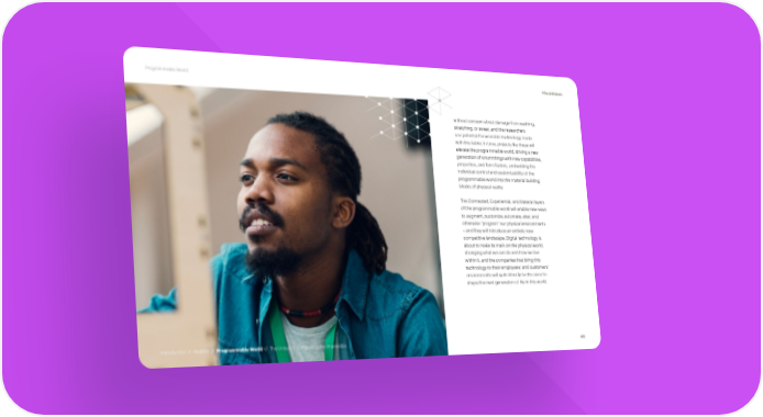 Programmable World #TechVision without concern about damage from washing, stretching, or sweat, and the researchers see potential for wearable technology made with this fabric. In time, projects like these will elevate the programmable world, driving a new generation of smart things with new capabilities, properties, and form factors, embedding the individual control and customizability of the programmable world into the material building blocks of physical reality. The Connected, Experiential, and Material layers of the programmable world will enable new ways to augment, customize, automate, alter, and otherwise “program” our physical environments – and they will introduce an entirely new competitive landscape. Digital technology is about to make its mark on the physical world, changing what we can do and how we live within it, and the companies that bring this technology to their employees’ and customers’ environments will quite literally be the ones to shape the next generation of life in this world. Introduction // WebMe // Programmable World // The Unreal // Computing the Impossible 48
