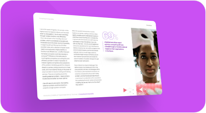Computing the Impossible #TechVision Look at the world of logistics, for example. At the While this wouldn’t eliminate the need for highest level, the logistics industry can be boiled logistics companies, making a central problem down to one question: How do we move things readily solvable would fundamentally transform through multiple locations most efficiently? what they do and how they do it. Consider the 69% This is also known as the “traveling salesman” improvements that would come with dynamic problem, which is considered computationally optimization of last-mile delivery in any city of global executives report intractable due to the sheer volume of possibility. with any fleet size – not only could heightened quantum computing will have A single trip with just 16 stops has 20 trillion consumer expectations for near-instantaneous a breakthrough or transformational possible routes, and a classical computer would delivery times be met, but traffic congestion and impact on their organizations need to compute every single possibility to environmental impacts could be dramatically in the future. find the most efficient one – an effort that even reduced. And on a much larger scale too, the fastest computers could take decades to worldwide freight transport efficiency would 170 compute. Efficiency is the table stake for see massive improvements and enable the most logistics companies, but solving this core accommodation of sudden changes through efficiency problem is nearly impossible. So adaptive asset reallocation. instead, logistics companies solve subsections of the problem: tendering goods from shippers Every industry has “grand challenges” that directly to carriers, joining consortiums to lower define industry boundaries and inform the costs, and more recently relying on the power of core products, services, and strategies within. cloud and data to improve routing and tracking For instance, pharmaceutical companies are services. They are competing around the currently constrained by the protein folding traveling salesman problem – never solving it. problem, and the financial services industry Routes become better but never optimal. as we know it is predicated on the assumption that predicting the stock market and accurately Like with security encryption, the traveling modeling risk are very hard to do. But what if salesman problem could be solved by a they weren’t? powerful enough quantum computer. Introduction // WebMe // Programmable World // The Unreal // Computing the Impossible 75