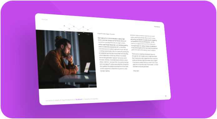 The Unreal #TechVision It wasn’t really magic, of course. But when Joshua posted his experience on social media, people were divided. Many found it creepy Eight years prior to this conversation, Jessica died and wrong, and certainly not everyone who is grieving due to a rare liver disease, but her fiancé Joshua still will benefit from this sort of interaction – on the 123 missed her incredibly. So late one night in 2020, contrary, it might prevent some from healing and Joshua used Project December – an interface enabling moving forward. For Joshua, however, the realness of users to create bots powered by GPT-3, one of the it was what brought out the memories and unresolved most advanced AI models to generate human-like text grief, all the while still knowing it wasn’t really her. – to bring Jessica back to life…in a sense. By training the AI model with text she had once written and including This human-to-machine conversation was only a short description of the two of them, he created through text, but imagine what it might have been the bot that generated “Jessica’s” text above, word like if Jessica also had a digital face that moved and for word. At times, it sounded exactly like her, and at spoke just like she might have when alive. Imagine others, it did not – but even then, he could remember if she were so realistic that you couldn’t tell if it was 124 her more clearly. Joshua recounted that, though far really her on the other side of that screen – or if she from perfect, the chatbot reminded him of her spirit, had been computer-generated. and the experience allowed him to grieve in a way he hadn’t before. What then? Introduction // WebMe // Programmable World // The Unreal // Computing the Impossible 58
