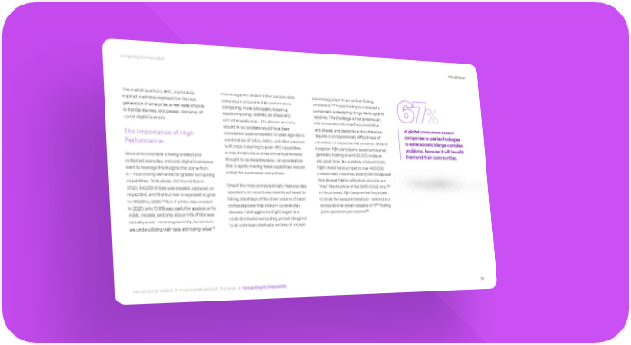 Computing the Impossible #TechVision This is what quantum, HPC, and biology- Increasingly the answer to this massive data processing power to run protein folding 173 inspired machines represent for the next conundrum is found in high performance simulations. Protein folding is a necessary generation of enterprise: a new suite of tools computing, more colloquially known as component to designing things like drugs and to handle the new, and greater, demands of supercomputing. Granted, as a field HPC vaccines. The challenge is that proteins can 67% a post-digital business. isn’t intrinsically new – the phones we carry fold themselves into countless possibilities around in our pockets would have been and shapes, and designing a drug therefore of global consumers expect The Importance of High considered supercomputers 30 years ago. But a requires a computationally difficult level of companies to use technologies Performance combination of GPUs, ASICs, and other purpose- simulation, or expensive trial and error. Since its to solve society’s large, complex built chips is starting to push HPC capabilities inception F@h participants waxed and waned, problems, because it will benefit More and more data is being created and to new thresholds and benchmarks previously generally hosting around 30,000 nodes at them and their communities. collected every day, and post-digital businesses thought to be decades away – an acceleration any given time. But suddenly, in March 2020, want to leverage the insights that come from that is rapidly making these capabilities mission F@h’s install base jumped to over 400,000 it – thus driving demands for greater computing critical for businesses everywhere. independent machines, adding the horsepower capabilities. To illustrate, IDC found that in that allowed F@h to effectively simulate and One of the most computationally intensive data 174 2020, 64.2ZB of data was created, captured, or “map” the structure of the SARS-CoV-2 virus. replicated, and that number is expected to grow operations on record was recently achieved by In the process, F@h became the first project 171 taking advantage of the sheer volume of latent to break the exascale threshold – defined as a to 180ZB by 2025. But of all the data created 18 in 2020, only 10.6% was useful for analysis or for compute power that exists in our everyday computational system capable of 10 floating 175 AI/ML models, and only about 44% of that was devices. Folding@home (F@h) began as a point operations per second. actually used – meaning currently, businesses small distributed computing project designed 172 to let volunteers dedicate portions of unused are underutilizing their data and losing value. Introduction // WebMe // Programmable World // The Unreal // Computing the Impossible 78
