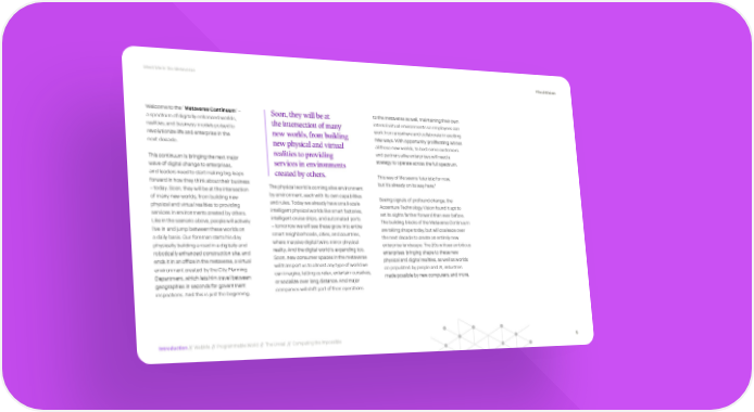 Meet Me in the Metaverse #TechVision Welcome to the “Metaverse Continuum” – Soon, they will be at to the metaverse as well, maintaining their own a spectrum of digitally enhanced worlds, the intersection of many internal virtual environments so employees can realities, and business models poised to new worlds, from building work from anywhere and collaborate in exciting revolutionize life and enterprise in the new ways. With opportunity proliferating across next decade. new physical and virtual all these new worlds, to best serve customers realities to providing and partners alike enterprises will need a This continuum is bringing the next major services in environments strategy to operate across the full spectrum. wave of digital change to enterprises, and leaders need to start making big leaps created by others. This way of life seems futuristic for now, forward in how they think about their business 1 The physical world is coming alive environment but it’s already on its way here. – today. Soon, they will be at the intersection by environment, each with its own capabilities of many new worlds, from building new and rules. Today we already have small-scale Seeing signals of profound change, the physical and virtual realities to providing intelligent physical worlds like smart factories, Accenture Technology Vision found it apt to services in environments created by others. intelligent cruise ships, and automated ports set its sights farther forward than ever before. Like in the scenario above, people will actively – tomorrow we will see these grow into entire The building blocks of the Metaverse Continuum live in and jump between these worlds on smart neighborhoods, cities, and countries, are taking shape today, but will coalesce over a daily basis. Our foreman starts his day where massive digital twins mirror physical the next decade to create an entirely new physically building a road in a digitally and reality. And the digital world is expanding too. enterprise landscape. The 20s will see ambitious robotically enhanced construction site, and Soon, new consumer spaces in the metaverse enterprises bringing shape to these new ends it in an office in the metaverse, a virtual will transport us to almost any type of world we physical and digital realities, as well as worlds environment created by the City Planning can imagine, letting us relax, entertain ourselves, co-populated by people and AI, industries Department, which lets him travel between or socialize over long distance. And major made possible by new computers, and more. geographies in seconds for government companies will shift part of their operations inspections. And this is just the beginning. Introduction // WebMe // Programmable World // The Unreal // Computing the Impossible 5