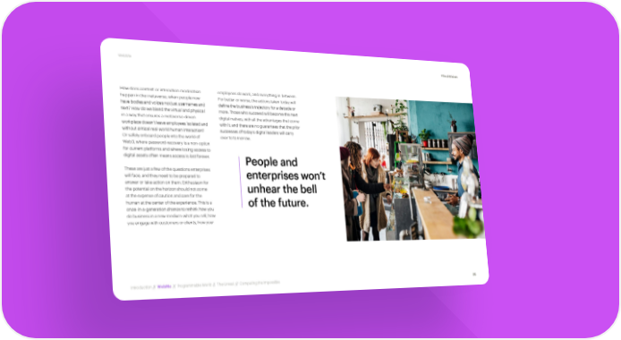 WebMe #TechVision How does content or interaction moderation employees do work, and everything in between. happen in the metaverse, when people now For better or worse, the actions taken today will have bodies and voices not just usernames and define the business’s trajectory for a decade or text? How do we blend the virtual and physical more. Those who succeed will become the next in a way that ensures a metaverse-driven digital natives, with all the advantages that come workplace doesn’t leave employees isolated and with it, and there are no guarantees that the prior without critical real-world human interaction? successes of today’s digital leaders will carry Or safely onboard people into the world of over to tomorrow. Web3, where password-recovery is a non-option for current platforms and where losing access to digital assets often means access is lost forever. People and These are just a few of the questions enterprises will face, and they need to be prepared to enterprises won’t answer or take action on them. Enthusiasm for the potential on the horizon should not come unhear the bell at the expense of caution and care for the human at the center of the experience. This is a of the future. once-in-a-generation chance to rethink how you do business in a new medium: what you sell, how you engage with customers or clients, how your Introduction // WebMe // Programmable World // The Unreal // Computing the Impossible 35