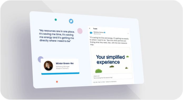 Salesforce Partner Resource Map | Testimonial Page 12 Page 14“My resources are in one place. It’s saving me time, it’s saving me energy and it’s getting me directly where I need to be” Winter Green-Ike Marketing Manager Blueprint Advisory