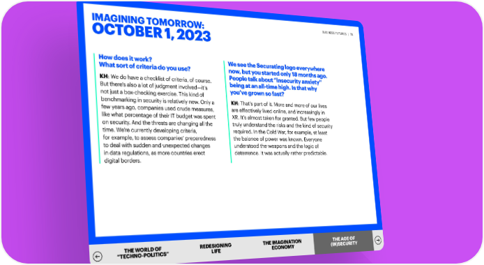 IMAGINING TOMORROW: BUSINESS FUTURES | 76 OCTOBER 1, 2023 How does it work? We see the Securating logo everywhere What sort of criteria do you use? now, but you started only 18 months ago. KH: We do have a checklist of criteria, of course. People talk about “insecurity anxiety” But there’s also a lot of judgment involved—it’s being at an all-time high. Is that why not just a box-checking exercise. This kind of you’ve grown so fast? benchmarking in security is relatively new. Only a KH: That’s part of it. More and more of our lives few years ago, companies used crude measures, are effectively lived online, and increasingly in like what percentage of their IT budget was spent XR. It’s almost taken for granted. But few people on security. And the threats are changing all the truly understand the risks and the kind of security time. We’re currently developing criteria, required. In the Cold War, for example, at least for example, to assess companies’ preparedness the balance of power was known. Everyone to deal with sudden and unexpected changes understood the weapons and the logic of in data regulations, as more countries erect deterrence. It was actually rather predictable. digital borders. THE WORLD OF REDESIGNING THE IMAGINATION TTHHE AE AGGE OE OFF “TECHNO-POLITICS” LIFE ECONOMY ((IINN))SESECUCURITRITYY