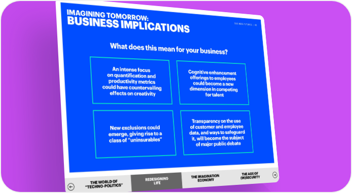 IMAGINING TOMORROW: BUSINESS FUTURES | 43 BUSINESS IMPLICATIONS What does this mean for your business? An intense focus Cognitive enhancement on quantification and offerings to employees productivity metrics could become a new could have countervailing dimension in competing effects on creativity for talent Transparency on the use New exclusions could of customer and employee emerge, giving rise to a data, and ways to safeguard class of “uninsurables” it, will become the subject of major public debate THE WORLD OF REDEREDESIGSIGNNIINNGG THE IMAGINATION THE AGE OF “TECHNO-POLITICS” LILIFEFE ECONOMY (IN)SECURITY