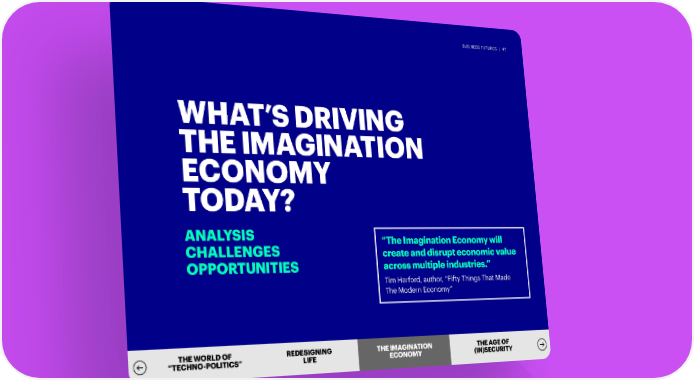 BUSINESS FUTURES | 47 WHAT’S DRIVING THE IMAGINATION ECONOMY TODAY? ANALYSIS “The Imagination Economy will CHALLENGES create and disrupt economic value OPPORTUNITIES across multiple industries.” Tim Harford, author, “Fifty Things That Made The Modern Economy” THE WORLD OF REDESIGNING THTHEE I IMAMAGIGINANATIONTION THE AGE OF “TECHNO-POLITICS” LIFE E ECONOMYCONOMY (IN)SECURITY