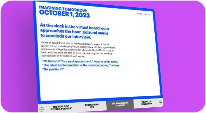 IMAGINING TOMORROW: BUSINESS FUTURES | 60 OCTOBER 1, 2023 As the clock in the virtual boardroom approaches the hour, Koizumi needs to conclude our interview. He has an appointment with his intellectual property lawyer: A rival XR tourism startup is challenging VirTur’s exclusive deal with Peru’s government, which makes it illegal for other providers to render Machu Picchu in virtual form. He is alerted to the time by a secretary opening the door, nodding apologetically in my direction, and saying: “Mr Koizumi? Your next appointment.” Koizumi grins at me. “Our latest implementation of the calendar pop-up,” he says. “Do you like it?” THE WORLD OF REDESIGNING THTHEE I IMAMAGIGINANATIONTION THE AGE OF “TECHNO-POLITICS” LIFE E ECONOMYCONOMY (IN)SECURITY