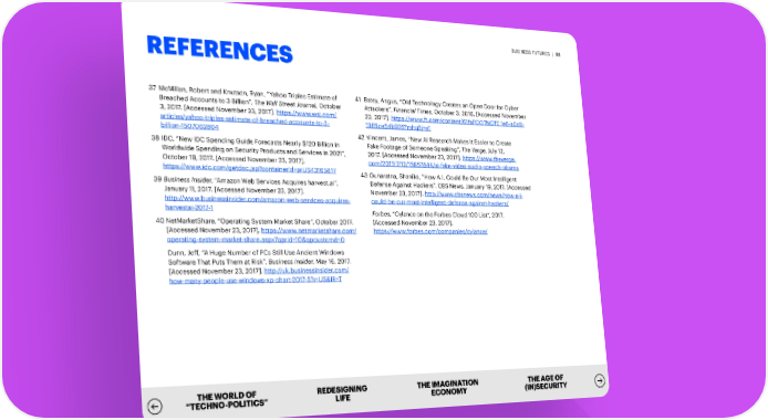 BUSINESS FUTURES | 88 REFERENCES 37 McMillan, Robert and Knutson, Ryan, “Yahoo Triples Estimate of 41 Batey, Angus, “Old Technology Creates an Open Door for Cyber Breached Accounts to 3 Billion”, The Wall Street Journal, October Attackers”, Financial Times, October 3, 2016. [Accessed November 3, 2017. [Accessed November 23, 2017]. https://www.wsj.com/ 23, 2017]. https://www.ft.com/content/61faFOOTNOTE 1e6-a0c9- articles/yahoo-triples-estimate-of-breached-accounts-to-3- 1365ce54b926?mhq5j=e1 billion-1507062804 42 Vincent, James, “New AI Research Makes It Easier to Create 38 IDC, “New IDC Spending Guide Forecasts Nearly $120 Billion in Fake Footage of Someone Speaking”, The Verge, July 12, Worldwide Spending on Security Products and Services in 2021”, 2017. [Accessed November 23, 2017]. https://www.theverge. October 19, 2017. [Accessed November 23, 2017]. com/2017/7/12/15957844/ai-fake-video-audio-speech-obama https://www.idc.com/getdoc.jsp?containerId=prUS43165817 43 Gunaratna, Shanika, “How A.I. Could Be Our Most Intelligent 39 Business Insider, “Amazon Web Services Acquires harvest.ai”, Defense Against Hackers”, CBS News, January 19, 2017. [Accessed January 11, 2017. [Accessed November 23, 2017]. November 23, 2017]. http://www.cbsnews.com/news/how-a-i- http://www.businessinsider.com/amazon-web-services-acquires- could-be-our-most-intelligent-defense-against-hackers/ harvestai-2017-1 Forbes, “Cylance on the Forbes Cloud 100 List”, 2017. 40 NetMarketShare, “Operating System Market Share”, October 2017. [Accessed November 23, 2017]. [Accessed November 23, 2017]. https://www.netmarketshare.com/ https://www.forbes.com/companies/cylance/ operating-system-market-share.aspx?qprid=10&qpcustomd=0 Dunn, Jeff, “A Huge Number of PCs Still Use Ancient Windows Software That Puts Them at Risk”, Business Insider, May 16, 2017. [Accessed November 23, 2017]. http://uk.businessinsider.com/ how-many-people-use-windows-xp-chart-2017-5?r=US&IR=T THE WORLD OF REDESIGNING THE IMAGINATION THE AGE OF “TECHNO-POLITICS” LIFE ECONOMY (IN)SECURITY