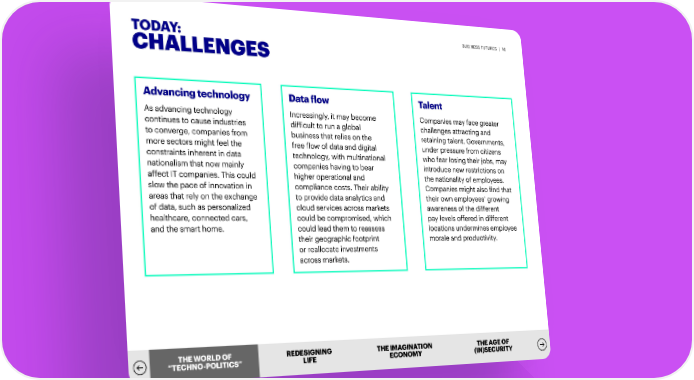 TODAY: BUSINESS FUTURES | 16 CHALLENGES Advancing technology Data flow Talent As advancing technology Increasingly, it may become Companies may face greater continues to cause industries difficult to run a global challenges attracting and to converge, companies from business that relies on the retaining talent. Governments, more sectors might feel the free flow of data and digital under pressure from citizens constraints inherent in data technology, with multinational who fear losing their jobs, may nationalism that now mainly companies having to bear introduce new restrictions on affect IT companies. This could higher operational and the nationality of employees. slow the pace of innovation in compliance costs. Their ability Companies might also find that areas that rely on the exchange to provide data analytics and their own employees’ growing of data, such as personalized cloud services across markets awareness of the different healthcare, connected cars, could be compromised, which pay levels offered in different and the smart home. could lead them to reassess locations undermines employee their geographic footprint morale and productivity. or reallocate investments across markets. THTHEE W WORLDORLD OF OF REDESIGNING THE IMAGINATION THE AGE OF ““TETECHCHNONO--PPOLOLIITTIICSCS”” LIFE ECONOMY (IN)SECURITY