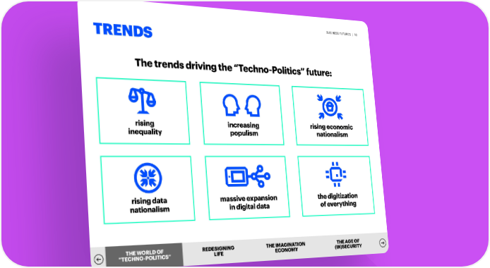 BUSINESS FUTURES | 10 TRENDS The trends driving the “Techno-Politics” future: rising increasing rising economic inequality populism nationalism rising data massive expansion the digitization nationalism in digital data of everything THTHEE W WORLDORLD OF OF REDESIGNING THE IMAGINATION THE AGE OF ““TETECHCHNONO--PPOLOLIITTIICSCS”” LIFE ECONOMY (IN)SECURITY