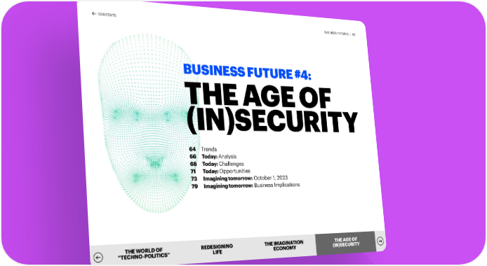 CONTENTS BUSINESS FUTURES | 62 BUSINESS FUTURE #4: THE AGE OF (IN)SECURITY 64 Trends 66 Today: Analysis 68 Today: Challenges 71 Today: Opportunities 73 Imagining tomorrow: October 1, 2023 79 Imagining tomorrow: Business Implications THE WORLD OF REDESIGNING THE IMAGINATION TTHHE AE AGGE OE OFF “TECHNO-POLITICS” LIFE ECONOMY ((IINN))SESECUCURITRITYY