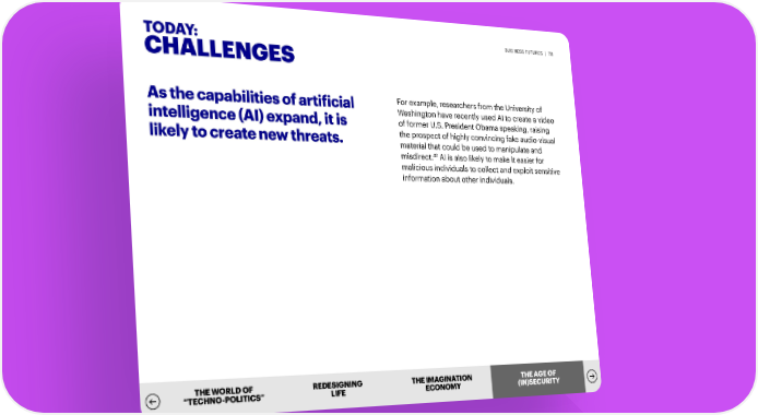 TODAY: BUSINESS FUTURES | 70 CHALLENGES As the capabilities of artificial For example, researchers from the University of Washington have recently used AI to create a video intelligence (AI) expand, it is of former U.S. President Obama speaking, raising likely to create new threats. the prospect of highly convincing fake audio-visual material that could be used to manipulate and 42 misdirect. AI is also likely to make it easier for malicious individuals to collect and exploit sensitive information about other individuals. THE WORLD OF REDESIGNING THE IMAGINATION TTHHE AE AGGE OE OFF “TECHNO-POLITICS” LIFE ECONOMY ((IINN))SESECUCURITRITYY
