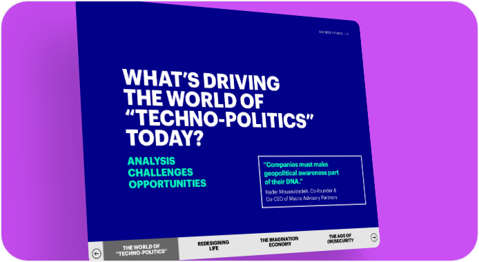 BUSINESS FUTURES | 11 WHAT’S DRIVING THE WORLD OF “TECHNO-POLITICS” TODAY? ANALYSIS “Companies must make CHALLENGES geopolitical awareness part OPPORTUNITIES of their DNA.” Nader Mousavizadeh, Co-founder & Co-CEO of Macro Advisory Partners THTHEE W WORLDORLD OF OF REDESIGNING THE IMAGINATION THE AGE OF ““TETECHCHNONO--PPOLOLIITTIICSCS”” LIFE ECONOMY (IN)SECURITY