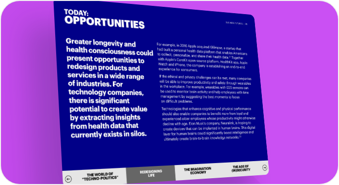 TODAY: BUSINESS FUTURES | 35 OPPORTUNITIES Greater longevity and For example, in 2016 Apple acquired Gliimpse, a startup that had built a personal health data platform that enables Americans 22 health consciousness could to collect, personalize, and share their health data. Together present opportunities to with Apple’s CareKit open-source platform, HealthKit app, Apple Watch and iPhone, the company is establishing an end-to-end redesign products and experience for consumers. services in a wide range If the ethical and privacy challenges can be met, many companies of industries. For will be able to improve productivity and safety through wearables in the workplace. For example, wearables with EEG sensors can technology companies, be used to monitor brain activity and help employees with time management by suggesting the best moments to focus there is significant on difficult problems. potential to create value Technologies that enhance cognitive and physical performance by extracting insights should also enable companies to benefit more from loyal and experienced older employees whose productivity might otherwise from health data that decline with age. Elon Musk’s company, Neuralink, is hoping to create devices that can be implanted in human brains. This digital currently exists in silos. layer for human brains could significantly boost intelligence and ultimately create brain-to-brain knowledge networks.23 THE WORLD OF REDEREDESIGSIGNNIINNGG THE IMAGINATION THE AGE OF “TECHNO-POLITICS” LILIFEFE ECONOMY (IN)SECURITY