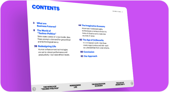 CONTENTS BUSINESS FUTURES | 2 3 What are 44 The Imagination Economy Business Futures? A dvances in extended reality 8 The World of technologies promise to break the limits of distance and create new “Techno-Politics” sources of value. S trict state control of cross-border data 62 The Age of (In)Security flows prompt a demand for geopolitical and technological savvy. I n a connected world, data flows 26 Redesigning Life create opportunities and risk—such as vulnerabilities from cyber attacks. H uman enhancement technologies 80 Conclusion are set to reboot performance and productivity—but raise ethical issues. 82 Our Approach THE WORLD OF REDESIGNING THE IMAGINATION THE AGE OF “TECHNO-POLITICS” LIFE ECONOMY (IN)SECURITY