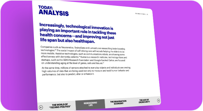 TODAY: BUSINESS FUTURES | 31 ANALYSIS Increasingly, technological innovation is playing an important role in tackling these health concerns—and improving not just life span but also healthspan. Companies such as Neuronetics, BrainsGate and Lumosity are researching brain-boosting 17 technologies. The social impact of self-driving cars will include helping the elderly to be more mobile. Assistive technologies, such as communications robots, are showing some 18 effectiveness with dementia patients. Numerous research institutes, technology titans and startups, such as the SENS Research Foundation and Google-backed Calico, are focused 19 on understanding aging at the level of genes, cells and tissues. At the same time, millions of sensors attached to everyday objects and individuals are creating high volumes of data that are being used not only to measure and track human behavior and performance, but also to predict, alter or enhance it. THE WORLD OF REDEREDESIGSIGNNIINNGG THE IMAGINATION THE AGE OF “TECHNO-POLITICS” LILIFEFE ECONOMY (IN)SECURITY