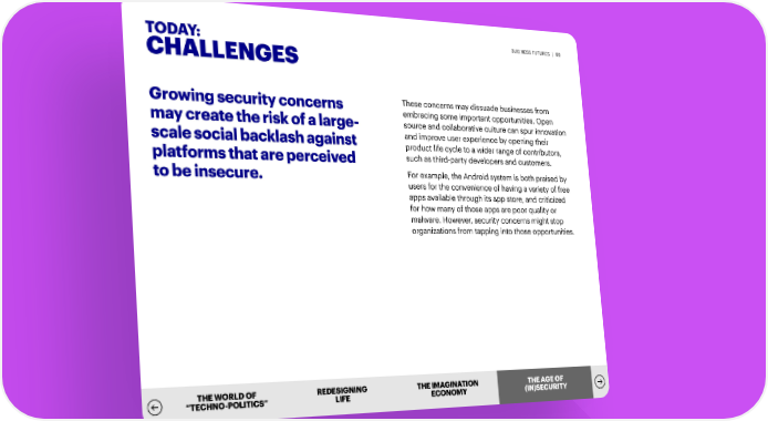 TODAY: BUSINESS FUTURES | 69 CHALLENGES Growing security concerns These concerns may dissuade businesses from embracing some important opportunities. Open may create the risk of a large- source and collaborative culture can spur innovation scale social backlash against and improve user experience by opening their product life cycle to a wider range of contributors, platforms that are perceived such as third-party developers and customers. to be insecure. For example, the Android system is both praised by users for the convenience of having a variety of free apps available through its app store, and criticized for how many of those apps are poor quality or malware. However, security concerns might stop organizations from tapping into those opportunities. THE WORLD OF REDESIGNING THE IMAGINATION TTHHE AE AGGE OE OFF “TECHNO-POLITICS” LIFE ECONOMY ((IINN))SESECUCURITRITYY