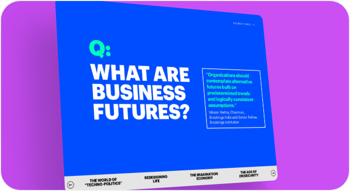 BUSINESS FUTURES | 3 Q: “Organizations should WHAT ARE contemplate alternative futures built on BUSINESS predetermined trends and logically consistent assumptions.” Vikram Mehta, Chairman, FUTURES? Brookings India and Senior Fellow, Brookings Institution THE WORLD OF REDESIGNING THE IMAGINATION THE AGE OF “TECHNO-POLITICS” LIFE ECONOMY (IN)SECURITY