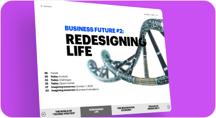 CONTENTS BUSINESS FUTURES | 26 BUSINESS FUTURE #2: REDESIGNING LIFE 28 Trends 30 Today: Analysis 33 Today: Challenges 35 Today: Opportunities 37 Imagining tomorrow: October 1, 2023 43 Imagining tomorrow: Business Implications THE WORLD OF REDEREDESIGSIGNNIINNGG THE IMAGINATION THE AGE OF “TECHNO-POLITICS” LILIFEFE ECONOMY (IN)SECURITY