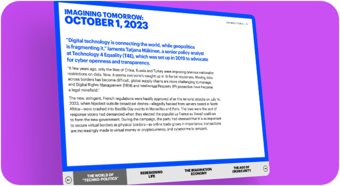 IMAGINING TOMORROW: BUSINESS FUTURES | 21 OCTOBER 1, 2023 “Digital technology is connecting the world, while geopolitics is fragmenting it,” laments Tatjana Mäkinen, a senior policy analyst at Technology 4 Equality (T4E), which was set up in 2019 to advocate for cyber openness and transparency. “A few years ago, only the likes of China, Russia and Turkey were imposing onerous nationalist restrictions on data. Now, it seems everyone’s caught up in tit-for-tat responses. Moving data across borders has become difficult, global supply chains are more challenging to manage, and Digital Rights Management (DRM) and Intellectual Property (IP) protection have become a legal minefield.” The new, stringent, French regulations were hastily approved after the terrorist attacks on July 14, 2023, when hijacked outside-broadcast drones—allegedly hacked from servers based in North Africa—were crashed into Bastille Day events in Marseilles and Paris. The laws were the sort of response voters had demanded when they elected the populist La France au Travail coalition to form the new government. During the campaign, the party had stressed that it is as important to secure virtual borders as physical borders—as online trade grows in importance, transactions are increasingly made in virtual money or cryptocurrency, and cybercrime is rampant. THTHEE W WORLDORLD OF OF REDESIGNING THE IMAGINATION THE AGE OF ““TETECHCHNONO--PPOLOLIITTIICSCS”” LIFE ECONOMY (IN)SECURITY