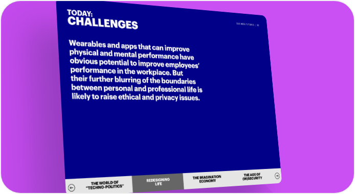 TODAY: BUSINESS FUTURES | 33 CHALLENGES Wearables and apps that can improve physical and mental performance have obvious potential to improve employees’ performance in the workplace. But their further blurring of the boundaries between personal and professional life is likely to raise ethical and privacy issues. THE WORLD OF REDEREDESIGSIGNNIINNGG THE IMAGINATION THE AGE OF “TECHNO-POLITICS” LILIFEFE ECONOMY (IN)SECURITY
