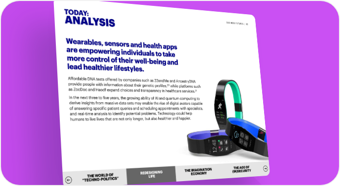 TODAY: BUSINESS FUTURES | 32 ANALYSIS Wearables, sensors and health apps are empowering individuals to take more control of their well-being and lead healthier lifestyles. Affordable DNA tests offered by companies such as 23andMe and AncestryDNA 20 provide people with information about their genetic profiles, while platforms such 21 as ZocDoc and Haodf expand choices and transparency in healthcare services. In the next three to five years, the growing ability of AI and quantum computing to derive insights from massive data sets may enable the rise of digital avatars capable of answering specific patient queries and scheduling appointments with specialists, and real-time analysis to identify potential problems. Technology could help humans to live lives that are not only longer, but also healthier and happier. THE WORLD OF REDEREDESIGSIGNNIINNGG THE IMAGINATION THE AGE OF “TECHNO-POLITICS” LILIFEFE ECONOMY (IN)SECURITY