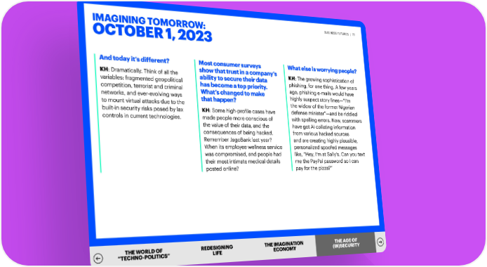 IMAGINING TOMORROW: BUSINESS FUTURES | 77 OCTOBER 1, 2023 And today it’s different? Most consumer surveys What else is worrying people? KH: Dramatically. Think of all the show that trust in a company’s KH: The growing sophistication of variables: fragmented geopolitical ability to secure their data phishing, for one thing. A few years competition, terrorist and criminal has become a top priority. ago, phishing e-mails would have networks, and ever-evolving ways What’s changed to make highly suspect story lines—“I’m to mount virtual attacks due to the that happen? the widow of the former Nigerian built-in security risks posed by lax KH: Some high-profile cases have defense minister”—and be riddled controls in current technologies. made people more conscious of with spelling errors. Now, scammers the value of their data, and the have got AI collating information consequences of being hacked. from various hacked sources Remember JagoBank last year? and are creating highly plausible, When its employee wellness service personalized spoofed messages was compromised, and people had like, “Hey, I’m at Sally’s. Can you text their most intimate medical details me the PayPal password so I can posted online? pay for the pizza?” THE WORLD OF REDESIGNING THE IMAGINATION TTHHE AE AGGE OE OFF “TECHNO-POLITICS” LIFE ECONOMY ((IINN))SESECUCURITRITYY