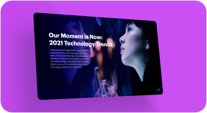 Our Moment is Now: 2021TechnologyTrends Companies arenolongerstrictlycompetingfor marketshare;theyarecompetingtobuildtheir visionof thefuturefasterthanthecompetition. Successwill dependontheirability to accelerate andmasterchangeinallparts oftheirbusiness, which in turn will be a direct function of the technologydecisionstheymaketoday.
