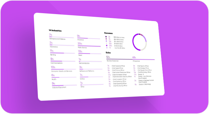 14Industries Revenues 2% 9% 2% $50billionormore 7% $20–$49.9 billion AerospaceandDefense Insurance 15% $10–$19.9 billion 2% 20% 26% $5–$9.9 billion 49% $1–$4.9 billion Automotive PublicService 1% Less than$1billion 11% 10% Roles Banking Retail 52% 48% 9% 1% Business Executives ITExecutives Communications Semiconductors 10% 3% 7% ChiefExecutive Officer 3% ChiefSecurity Officer 5% ChiefDigitalOfficer 5% ChiefStrategy Officer ConsumerGoodsandServices SoftwareandPlatforms 9% ChiefFinanceOfficer 2% ChiefSupplyChainOfficer 4% ChiefHumanResources Officer 13% ChiefTechnology Officer 6% 7% 10% ChiefInformation Officer 10% Director, IT 2% Chief Information Security Officer 1% Director, Line of Business Health Utilities 5% ChiefInnovation Officer (NonIT-related) 9% 1% 7% ChiefMarketing Officer 3% Director of Business Function 8% ChiefOperatingOfficer (NonIT-related) IndustrialEquipment Other 1% ChiefPurchasingOfficer 6% Director of Technology