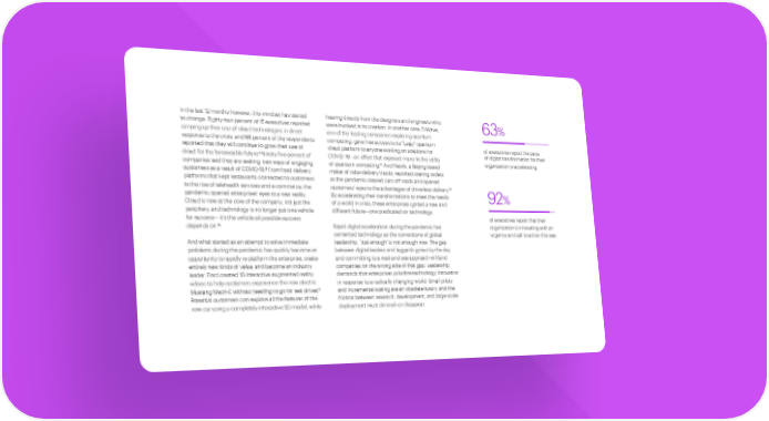 In the last 12 months however, this mindset has started hearing directly from the designers and engineers who to change. Eighty-two percent of IT executives reported were involved in its creation. In another case, D-Wave, 63% rampinguptheiruseofcloudtechnologies indirect one of the leading companies exploring quantum response to the crisis, and 66 percent of the respondents computing, gave free access to its “Leap” quantum of executives report the pace reported that they will continue to grow their use of cloud platform to anyone working on solutions for of digital transformation for their cloud for the foreseeable future.8Ninety-five percent of COVID-19—an effort that exposed many to the utility companies said they are seeking new ways of engaging of quantum computing.12And Neolix, a Beijing-based organization isaccelerating. 9From food delivery maker of robo-delivery trucks, reported soaring orders customers as a result of COVID-19. platforms that kept restaurants connected to customers asthepandemiccleared cars offroads andopened to the rise of telehealth services and e-commerce, the customers’ eyes to the advantages of driverless delivery.13 pandemicopenedenterprises’eyesto anewreality. Byaccelerating their transformations to meet the needs 92% Cloud is now at the core of the company, not just the of a world in crisis, these enterprises ignited a new and periphery, andtechnology isnolonger just onevehicle different future—one predicated on technology. for success— it’s the vehicle all possible success of executives report that their 10 Rapid digital acceleration during the pandemic has organization is innovating with an dependson. cemented technology as the cornerstone of global urgencyandcall toaction thisyear. And what started as an attempt to solve immediate leadership. ‘Just enough’ is not enough now. The gap problems during the pandemic has quickly become an between digital leaders and laggards grows by the day opportunity to rapidly re-platform the enterprise, create and committing to a wait-and-see approach will land entirely new kinds of value, and become an industry companies on the wrong side of that gap. Leadership leader. Ford created 10 interactive augmented reality demands that enterprises prioritize technology innovation videos to help customers experience the new electric in response to a radically changing world. Small pilots 11 Mustang Mach-E without needing to go for test drives. and incremental scaling are an obsolete luxury, and the Potential customers can explore all the features of the friction between research, development, and large-scale newcarusingacompletelyinteractive 3Dmodel,while deployment must diminishordisappear.