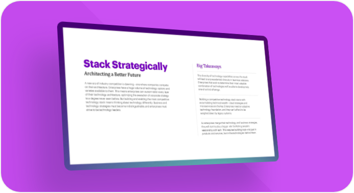 StackStrategically BigTakeaways ArchitectingaBetterFuture The diversity of technology capabilities across the stack will lead to unprecedented diversity in business solutions. Enterprises that work to determine their most valuable A new era of industry competition is dawning—one where companies compete combination of technologies will be able to develop truly on their architecture. Enterprises have a huge volume of technology options and one-of-a-kind offerings. varieties available to them. This means enterprises can custom-tailor every layer of their technology architecture, optimizing the execution of corporate strategy to a degree never seen before. But building and wielding the most competitive Building a competitive technology stack starts with technology stack means thinking about technology differently. Business and accumulating technical wealth—cloud strategies and technology strategies must become indistinguishable, and enterprises must microservices are the key. Enterprises need an adaptive strive to be technology leaders. technology foundation, and they can’t afford to be weigheddownbylegacysystems. Asenterprises merge their technology andbusinessstrategies, they will start to play a bigger role facilitating people’s relationship with tech. This requires building trust—not just in products andservices, but inthe technologies behind them.
