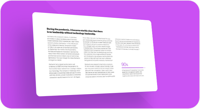 Duringthepandemic,itbecamestarklyclearthatthere isnoleadershipwithouttechnologyleadership. Just look at the restaurant industry. As lockdown three million new users had downloaded the app, enterprises reported deployment levels between and shelter-in-place mandates around the world andmobileordering anddrive-thru pickup combined 8 and 13 percent and expressed the expectations 5 closed traditional dine-in experiences, major chains accounted for 90 percent of sales. Starbucks used that they wouldreachbetween 30and50percent started to declare bankruptcy.2 In fact, 60 percent technologytoreinventitscustomer experience in three years. Or, as the Gartner analysts put it: of the restaurants listed as “temporarily closed” for a changed world, and when demand surged, “manufacturers hadbeenplanningto move to on Yelp in July were out of business permanently it doubled down.Thecompanypushedoutanew the cloud in three years, for the last five years.”7 3Six months into the pandemic, by September. integrated ticket management system to combine the National Restaurant Association reported that orders from Uber Eats, the Starbucks app, and drive- nearly three million workers remained unemployed, thru customers into a single workflow for baristas, andthefoodserviceindustry wasontracktolose and introduced a new espresso machine laden with 4And yet, through this chaos Starbucks $240 billion. sensors to help staff track how much coffee was emerged asaleader. 6 beingpouredandpredictnecessary maintenance. Starbucks had a digital transformation well Starbucks was prepared to lead when uncertainty 90% underwayby2020,andwhenthepandemichit, hit, but not every company was as fortunate. A year that transformation evolved from a strategic initiative ago, many were content to do ‘just enough’ to keep to a vital airbag. The company’s mobile app, which pacewiththeir competition. Case in point: Every of business and IT executives in our survey allows users to customize orders and pay for drinks year Gartner surveys manufacturers on their current agree that to be agile and resilient, their with their phones, proved invaluable as contactless and planned levels of cloud deployment across organizations need to fast forward their transactions rapidly became the norm. By August, enterprise systems. Andevery year from 2014to 2019 digital transformation with cloud at its core.