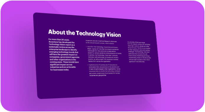 AbouttheTechnologyVision For more than 20 years, AccentureLabsandAccentureResearchcollaborate Asashortlistofthemesemerges Accenture has developed the ontheannualresearchprocess,whichincludes: from the research process, the Technology Technology Vision report as a Vision team works to validate and refine systematic review across the • Input from the Technology Vision External Advisory the set of trends. The themes are weighed enterprise landscape to identify Board, a group of more than two dozen experienced for their relevance to real-world business emerging technology trends that individuals from the public and private sectors, challenges. The Technology Vision team academia, venture capital and entrepreneurial companies. seeksideasthat transcendthewell- will have the greatest impact on In addition, the Technology Vision team conducts known drivers of technological change, companies, government agencies interviews with technology luminaries and industry concentrating instead on the themes that and other organizations in the experts, as well as nearly 100 Accenture business will soon start to appear on the C-level coming years. These trends have leadersfrom acrossthe organization. agendasofmostenterprises. significant impact across • A global survey of business and IT executives to industriesandareactionable understand their perspectives on the adoption and forbusinessestoday. impact of technologies in their organizations. Survey responses help to identify the technology strategies and priority investments of companies from across industries and geographies.