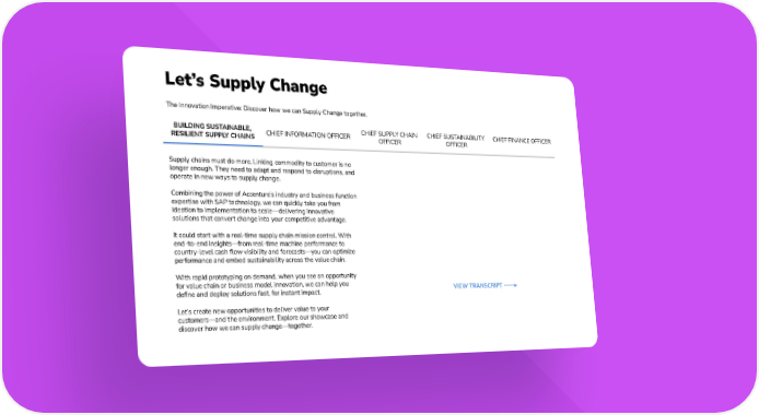 Let’s Supply Change The Innovation Imperative: Discover how we can Supply Change together. BUILDING SUSTAINABLE, CHIEF SUPPLY CHAIN CHIEF SUSTAINABILITY CHIEF FINANCE OFFICER CHIEF INFORMATION OFFICER RESILIENT SUPPLY CHAINS OFFICER OFFICER Supply chains must do more. Linking commodity to customer is no longer enough. They need to adapt and respond to disruptions, and operate in new ways to supply change. Combining the power of Accenture’s industry and business function expertise with SAP technology, we can quickly take you from ideation to implementation to scale—delivering innovative solutions that convert change into your competitive advantage. It could start with a real-time supply chain mission control. With end-to-end insights—from real-time machine performance to country-level cash flow visibility and forecasts—you can optimize performance and embed sustainability across the value chain. With rapid prototyping on demand, when you see an opportunity for value chain or business model innovation, we can help you VIEW TRANSCRIPT define and deploy solutions fast, for instant impact. Let’s create new opportunities to deliver value to your customers—and the environment. Explore our showcase and discover how we can supply change—together.