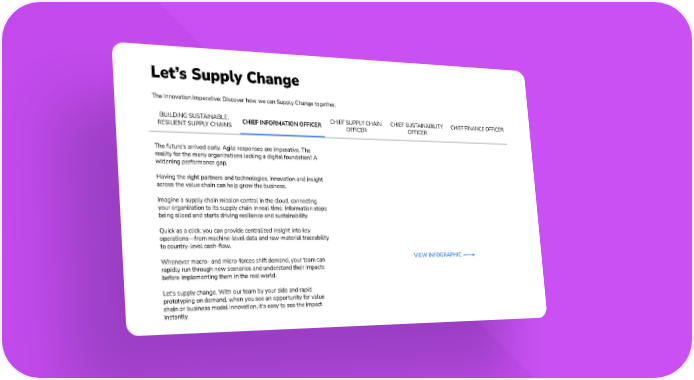 Let’s Supply Change The Innovation Imperative: Discover how we can Supply Change together. BUILDING SUSTAINABLE, CHIEF SUPPLY CHAIN CHIEF SUSTAINABILITY CHIEF FINANCE OFFICER CHIEF INFORMATION OFFICER RESILIENT SUPPLY CHAINS OFFICER OFFICER The future’s arrived early. Agile responses are imperative. The reality for the many organizations lacking a digital foundation? A widening performance gap. Having the right partners and technologies, innovation and insight across the value chain can help grow the business. Imagine a supply chain mission control in the cloud, connecting your organization to its supply chain in real-time. Information stops being siloed and starts driving resilience and sustainability. Quick as a click, you can provide centralized insight into key operations—from machine-level data and raw-material traceability to country-level cash-flow. VIEW INFOGRAPHIC Whenever macro- and micro-forces shift demand, your team can rapidly run through new scenarios and understand their impacts before implementing them in the real world. Let’s supply change. With our team by your side and rapid prototyping on demand, when you see an opportunity for value chain or business model innovation, it’s easy to see the impact instantly.