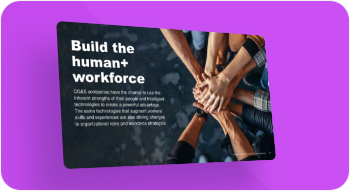 Build the human+ workforce CG&S companies have the chance to use the inherent strengths of their people and intelligent technologies to create a powerful advantage. The same technologies that augment workers’ skills and experiences are also driving changes to organizational roles and workforce strategies.