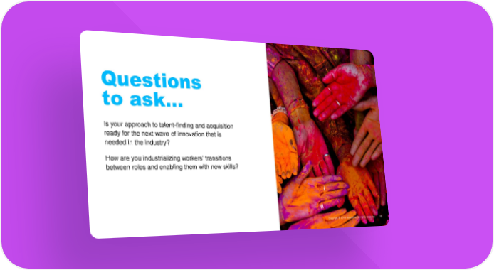 Questions to ask… Is your approach to talent-finding and acquisition ready for the next wave of innovation that is needed in the industry? How are you industrializing workers’ transitions between roles and enabling them with new skills?