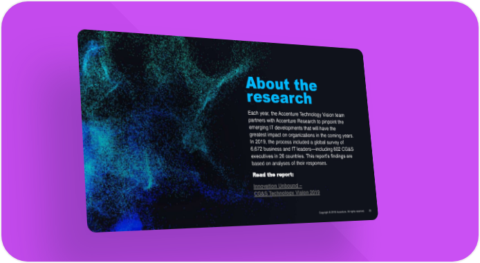 About the research Each year, the Accenture Technology Vision team partners with Accenture Research to pinpoint the emerging IT developments that will have the greatest impact on organizations in the coming years. In 2019, the process included a global survey of 6,672 business and IT leaders—including 602 CG&S executives in 26 countries. This report’s findings are based on analyses of their responses. Read the report: Innovation Unbound – CG&S Technology Vision 2019
