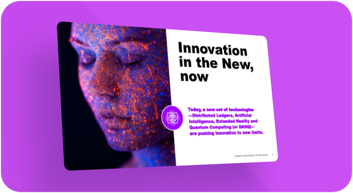 Tech Vision 2019 - Consumer Goods Page 3 Page 5Innovation in the New, now Today, a new set of technologies —Distributed Ledgers, Artificial Intelligence, Extended Reality and Quantum Computing (or DARQ)— are pushing innovation to new limits.