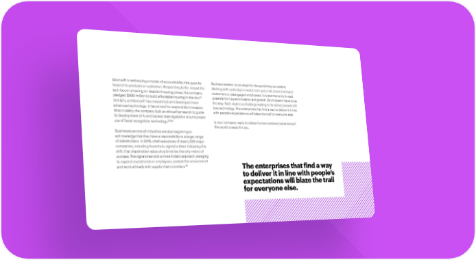 Microsoft is embracing a model of accountability that goes far Business leaders must adapt for the world they’ve created. beyond its products or customers. Responding to the impact the Sticking with yesterday’s models isn’t just a risk around annoyed tech boom is having on Seattle’s housing prices, the company customers or disengaged employees; it’s a permanently limited 22 pledged $500 million to build affordable housing in the city. potential for future innovation and growth. But it doesn’t have to be Similarly, as Microsoft has researched and developed more this way. Tech-clash is a challenge waiting to be solved: people still advanced technology, it has strived for responsible innovation. love technology. The enterprises that find a way to deliver it in line Most notably, the company built an ethical framework to guide with people’s expectations will blaze the trail for everyone else. its development of AI and backed state legislation around proper use of facial recognition technology.23,24 Is your company ready to deliver human-centered experiences? The world is ready for you. Businesses across all industries are also beginning to acknowledge that they have a responsibility to a larger range of stakeholders. In 2019, chief executives of nearly 200 major companies, including Accenture, signed a letter indicating this shift: that shareholder value should not be the only metric of success. The signatories took a more holistic approach, pledging to expand investments in employees, protect the environment and work ethically with supply chain providers.25 The enterprises that find a way to deliver it in line with people’s expectations will blaze the trail for everyone else.