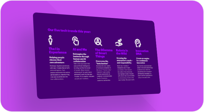 Our five tech trends this year: The I in AI and Me The Dilemma Robots in Innovation Experience Reimagine the of Smart the Wild DNA Helping people business through Things Growing the Create an engine choose their human and AI Overcome the enterprise’s reach— for continuous own adventure collaboration and responsibility innovation Take a new approach that “beta burden” Redesign digital experiences uses artificial intelligence Address the new reality Build new models of Tap into the unprecedented with new models that amplify to bring out the full power of product ownership in interaction and impact scale of disruptive technology personal agency. Turn of people. Move beyond the era of “forever beta.” as robotics move beyond available today. Build the passive audiences into active deploying AI for automation Transform pain points the walls of the enterprise. capabilities and ecosystem participants by transforming alone and push into the new into an opportunity to Companies in every industry partnerships necessary to one-way experiences into frontier of co-creation between create an unprecedented will unlock new opportunities assemble the organization’s true collaborations. people and machines. level of business- by introducing robots to the unique innovation DNA. customer partnership. next frontier: the open world.