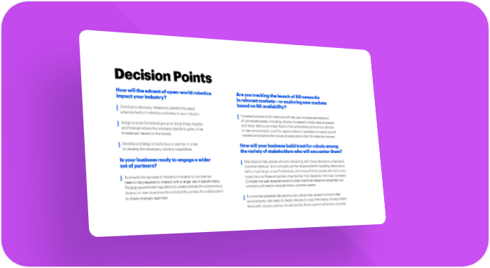 Decision Points How will the advent of open-world robotics Are you tracking the launch of 5G networks impact your industry? in relevant markets—or exploring new markets based on 5G availability? Conduct a discovery initiative to identify the latest advancements in robotics underway in your industry. Increased access to 5G networks will help spur widespread adoption of connected assets, including robotics. Increased mobile network speeds Assign a cross-functional group to study these insights and lower latency are major factors that will enable autonomous devices and forecast where the company stands to grow, or be in new environments. Look for opportunities to capitalize on nearby launch threatened, based on the trends. markets and explore the industrial applications that 5G networks present. Develop a strategy to build, buy or partner in order How will your business build trust for robots among to develop the necessary robotics capabilities. the variety of stakeholders who will encounter them? Is your business ready to engage a wider Take steps to help people who are interacting with these devices to understand set of partners? machine behavior. Your company will be responsible for handling interactions with a much larger array of individuals, and many of these people will not be your To ensure the success of robotics innovations, companies customers, so these encounters may be their first interaction with your company. need to be prepared to interact with a larger set of stakeholders. Consider the user experience and human-machine interaction expertise your Engage government regulators to create policies for autonomous company will need to navigate these uncertain waters. devices in new environments and identify vendors for collaboration to shape strategic agendas. To minimize potential disruptions your robots may cause in uncontrolled environments, take steps to design devices in a way that clearly conveys intent. Work with industry partners to standardize these systems whenever possible.