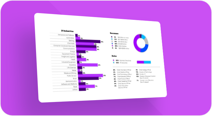 21 Industries Revenues Aerospace and Defense 1% 3% $50 billion or more Automotive 2% 10% $20-$49.9 billion Banking 11% 14% $10-$19.9 billion Chemicals 8% 26% $5-$9.9 billion Consumer Goods and Services 9% 45% $1-$4.9 billion 2% $250-$999 million Communications 9% Energy 4% Equipment Finance 1% Roles Freight and Logistics 2% Health 4% 50% Business Executives Industrial Equipment 1% 50% IT Executives Insurance 9% Life Sciences 2% Media 1% 8% Chief Information Officer 4% Chief Strategy Officer Metals and Mining 2% 2% Chief Mobility Officer 11% Director of Technology Public Service 11% 9% Chief Technology Officer 13% Director, IT Retail 9% 7% Chief Marketing Officer 15% Director of Business Function 8% Chief Finance Officer (Non IT-related) Semiconductors 1% 9% Chief Operating Officer 7% Director, Line of Business Software and Platforms 3% 3% Chief Security Officer (Non IT-related) Travel 7% 4% Chief Information Utilities 3% Security Officer