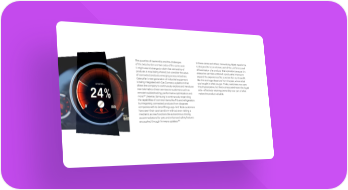The question of ownership and the challenges In these cases and others, the evolving digital experience of the beta burden are two sides of the same coin. is designed to be an intrinsic part of the usefulness and It might sound strange to claim that ownership of differentiation of a product. That’s possible because the products is now being shared, but consider the wave enterprise can take control of a product to improve or of connected products emerging across industries. expand the experience after a person has purchased it. Caterpillar’s new generation of industrial equipment But this is a huge departure from the past, where what is being integrated with Cat Connect, a platform that you bought is what you got. Today, customers may own allows the company to continuously explore and introduce the physical piece, but the business administers the digital new telematics-driven services to customers such as side—effectively retaining ownership over part of what remote troubleshooting, performance optimization and makes the product valuable. 6,7 more. Likewise, Samsung is continuously expanding the capabilities of common items like TVs and refrigerators by integrating connected products from disparate companies with its SmartThings app. And Tesla customers have seen their cars transform without ever visiting a mechanic as new functions like autonomous driving, accommodations for pets and enhanced safety features are pushed through firmware updates.8,9