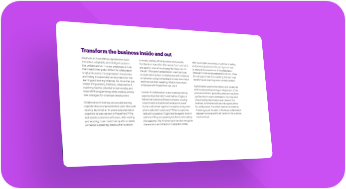 Transform the business inside and out Advances in AI are letting organizations build is merely reading off of the slides and provide offer live insights about how a customer is feeling interactive, adaptable and intelligent systems feedback on how often filler words (“um” and “ah”) and provide guidance to the call agent on how that collaborate with human employees to help are used or insensitive phrases like “best man for to improve the experience. This collaboration them reach their goals. While this collaboration the job.” Microsoft’s presentation coach isn’t just between human employees and AI not only offers is valuable across the organization, businesses an automated system; it collaborates with individual the call agents real-time coaching, but also helps are finding it’s especially transformative for their employees, using live feedback to help them learn identify future coaching opportunities for them. learning and training initiatives. Far more than just and improve their speaking. What’s more, every streamlining existing methods, collaborative AI employee with PowerPoint can use it. Sophisticated systems that interact and collaborate coaching has the potential to democratize and with humans are becoming an integral part of the expand HR programming, while creating entirely Human-AI collaboration is also creating training work environment, generating ideas and solutions new strategies for employee development. opportunities that didn’t exist before. Cogito, a just like their human counterparts. It’s a new kind behavioral science software company, is using of partnership that impacts every level of the Collaborative AI training can provide learning voice-to-text and sentiment analysis to coach business, and leaders will see that opportunities opportunities at unprecedented scale. Microsoft human call center agents in empathy during their for collaborative AI are both external and internal. 19 recently launched an AI-powered presentation phone calls with customers. When a customer AI training is just the start. In the future, collaboration 18 coach for its web version of PowerPoint. The calls with a question, Cogito lets the agents know in between humans and AI will transform the business tool assists presenters with pace, slide reading real time if they are speaking too fast or interrupting inside and out. and wording. It can track how quickly or slowly the customer. The AI-driven tech can also recognize someone is speaking, detect when a person the emotion and inflection in people’s voices,